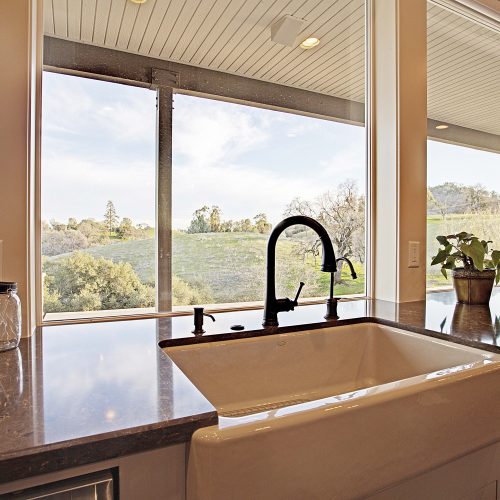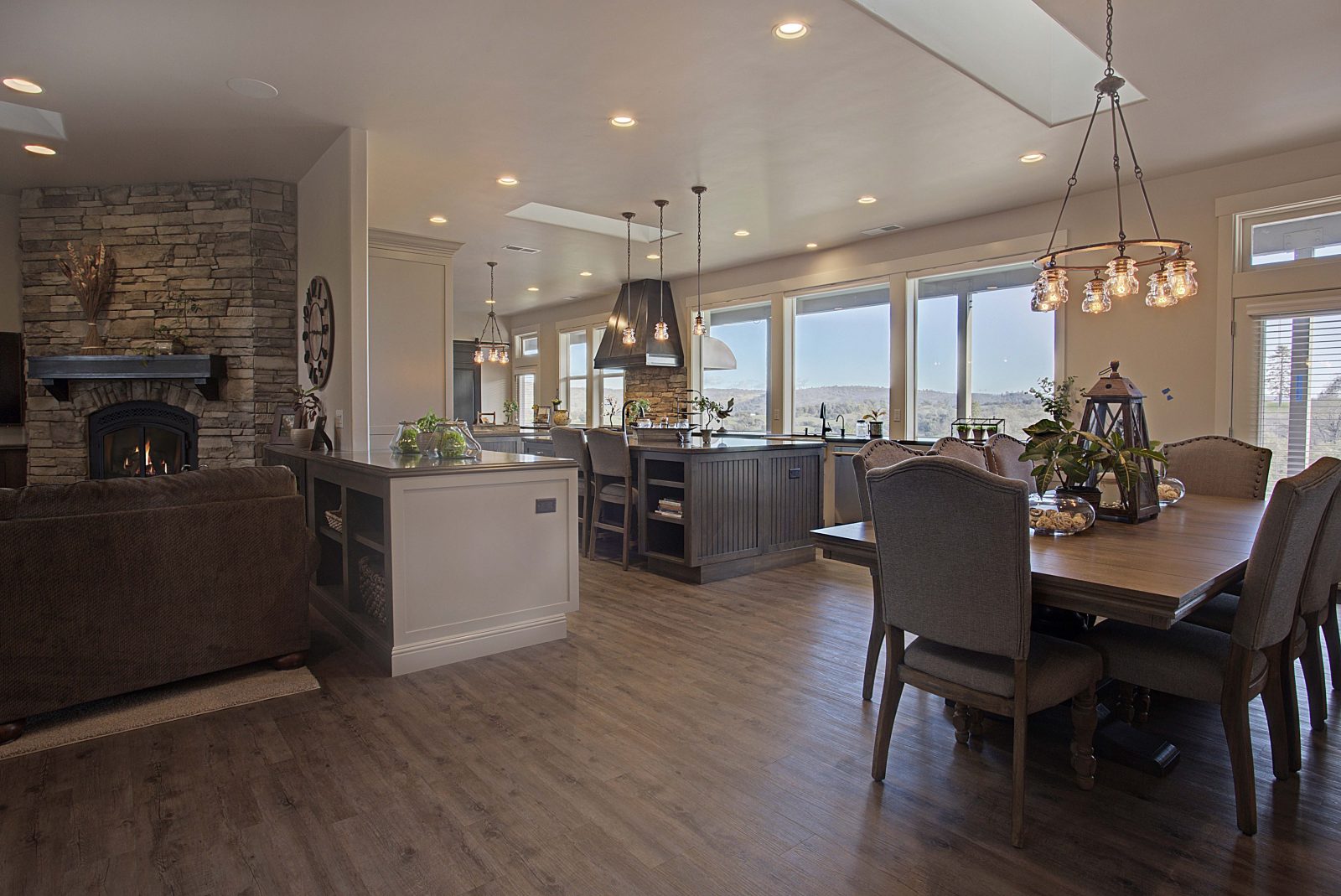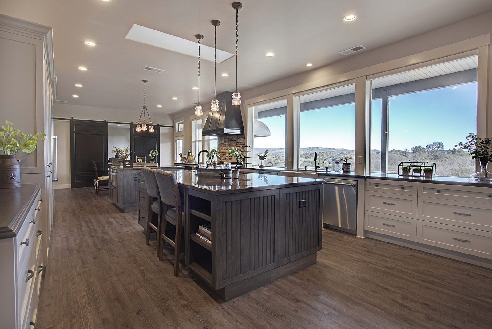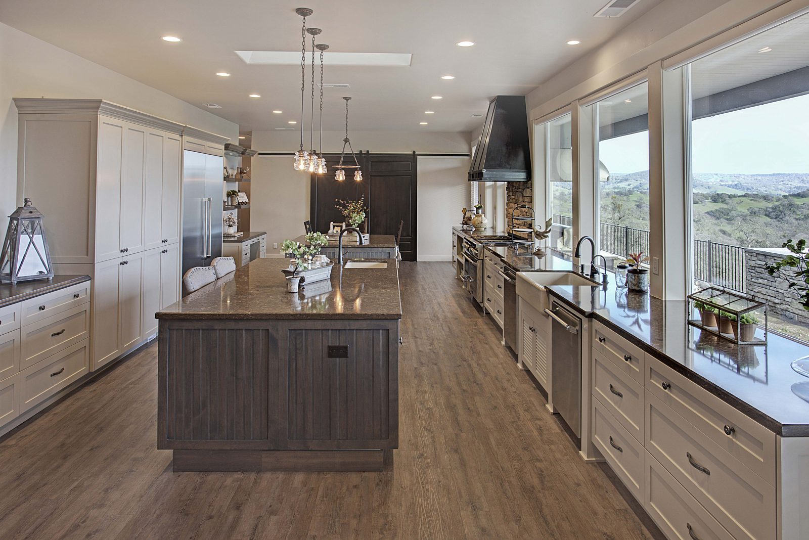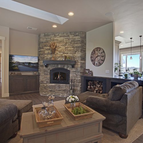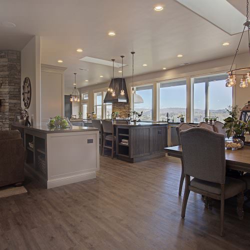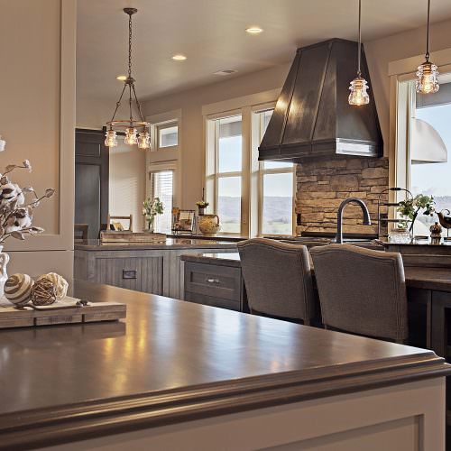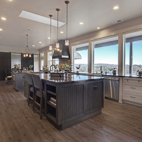 This 5,000 s.f. received a complete interior remodel and was a challenge due to the oversized rooms and overall rectangular shape. The kitchen was designed around existing skylights and windows maximizing all incoming light and taking full advantage of the spectacular views this property has to offer. One of the outstanding features of this home is the iron work. The stove hood, fireplace mantle and firebox are all custom made with matching iron materials. The iron is repeated in the lighting throughout the home. The drive up appeal has been transformed with new exterior paint and front door. Download the project overview pdf »