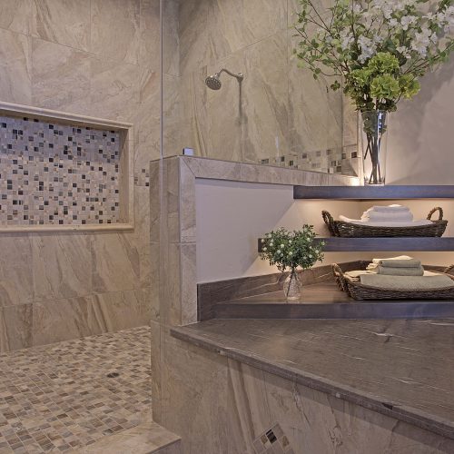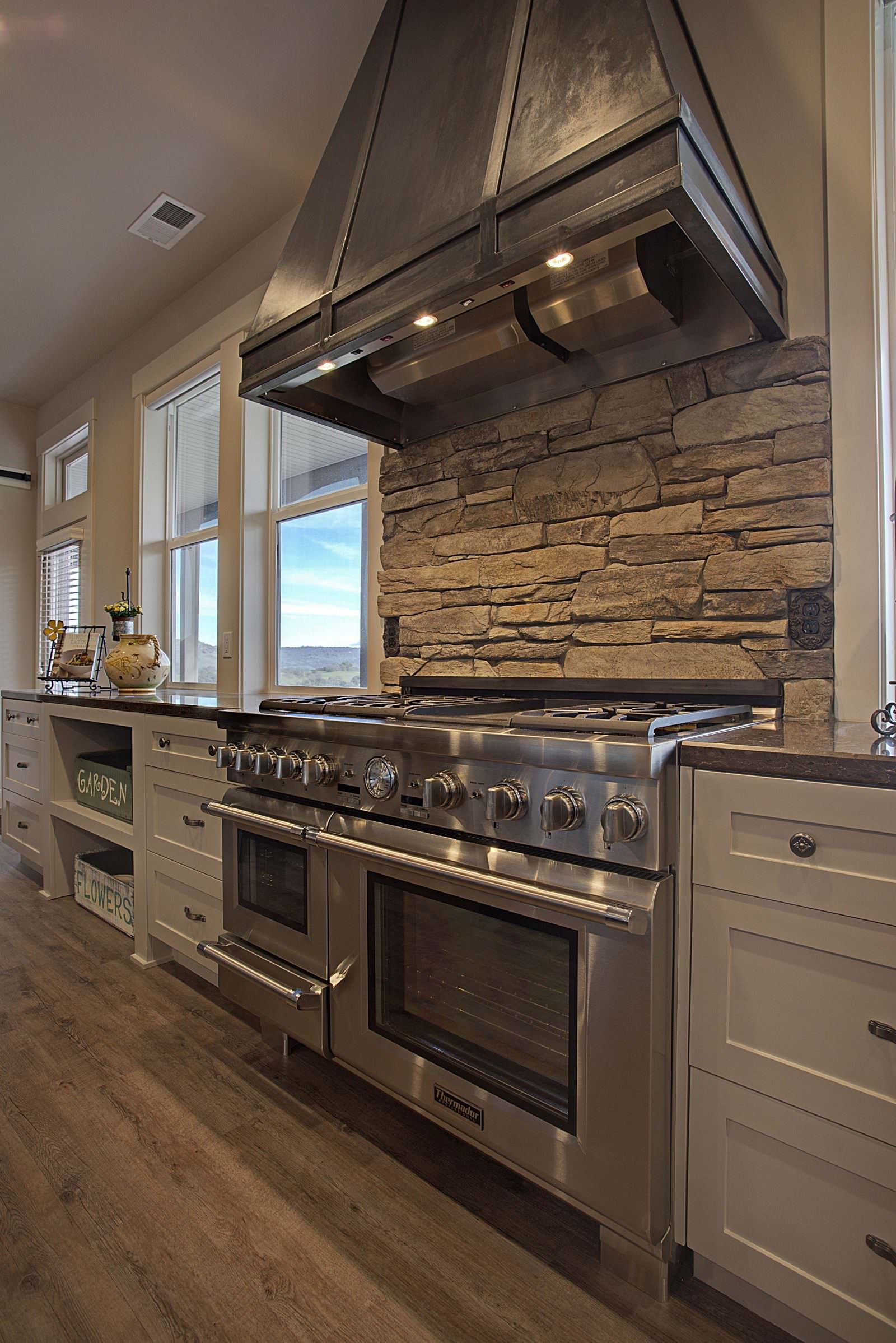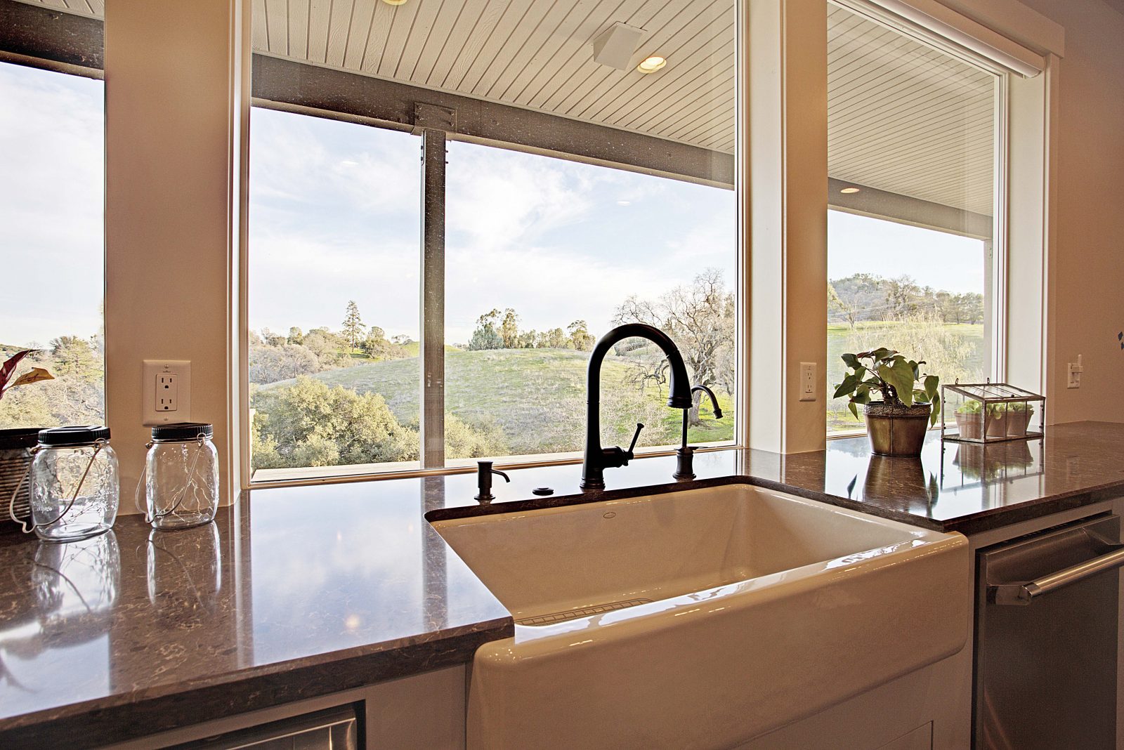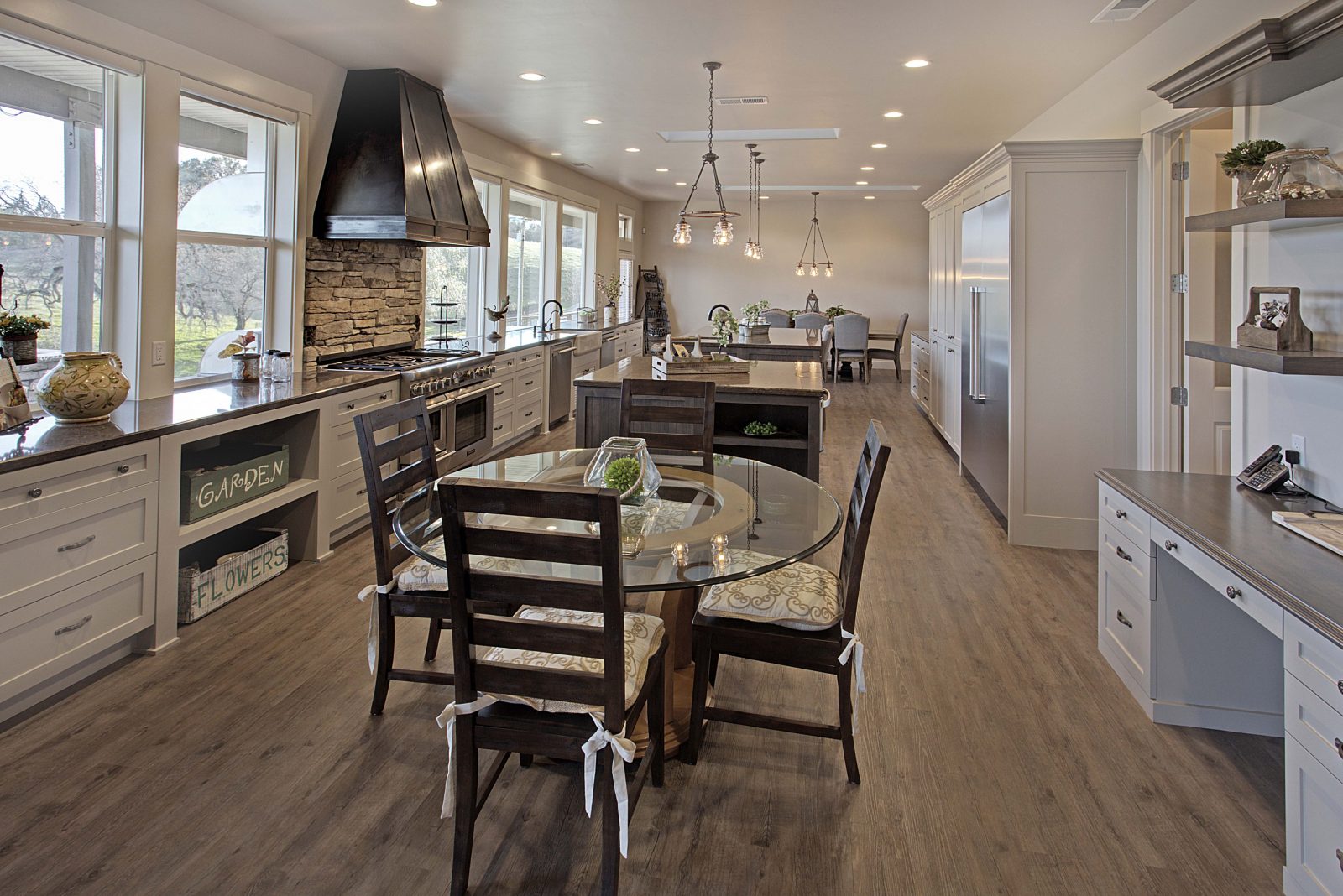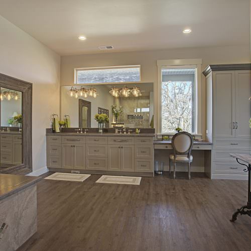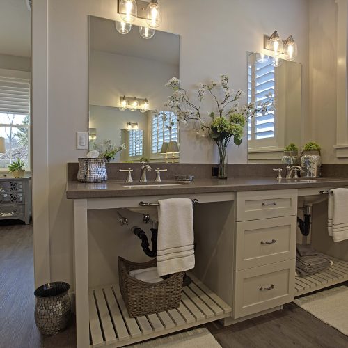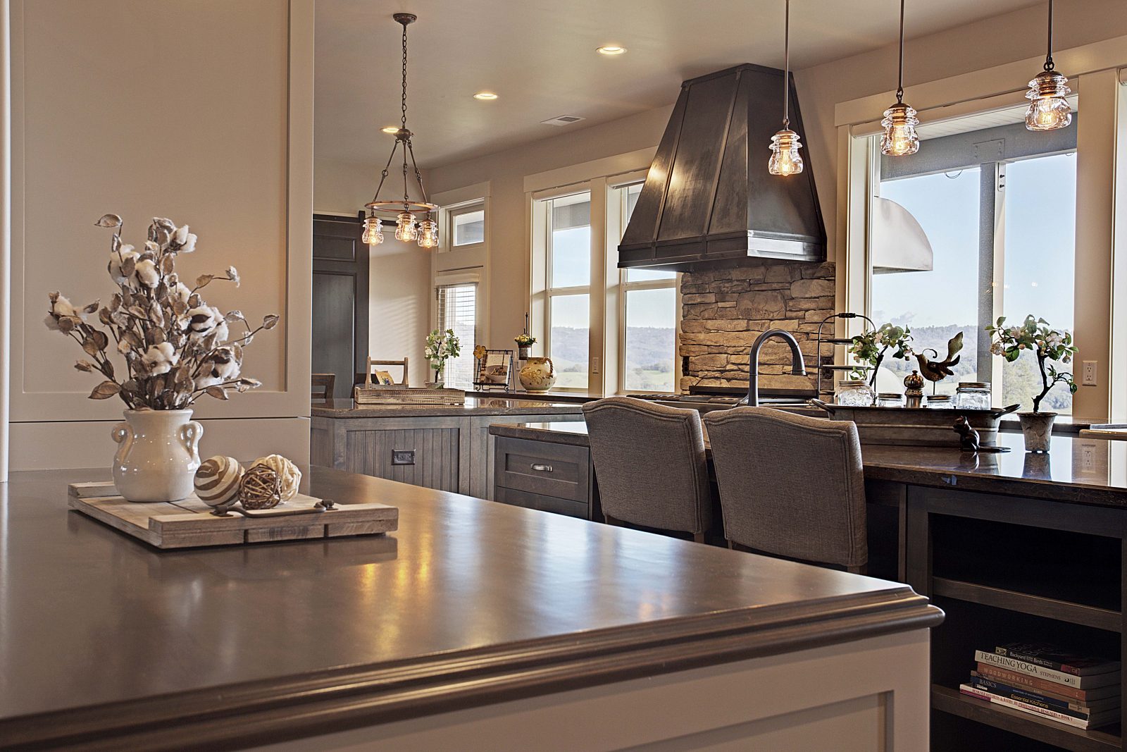 This 5,000 s.f. received a complete interior remodel and was a challenge due to the oversized rooms and overall rectangular shape. The kitchen was designed around existing skylights and windows maximizing all incoming light and taking full advantage of the spectacular views this property has to offer. One of the outstanding features of this home is the iron work. The stove hood, fireplace mantle and firebox are all custom made with matching iron materials. The iron is repeated in the lighting throughout the home. The drive up appeal has been transformed with new exterior paint and front door. Download the project overview pdf »